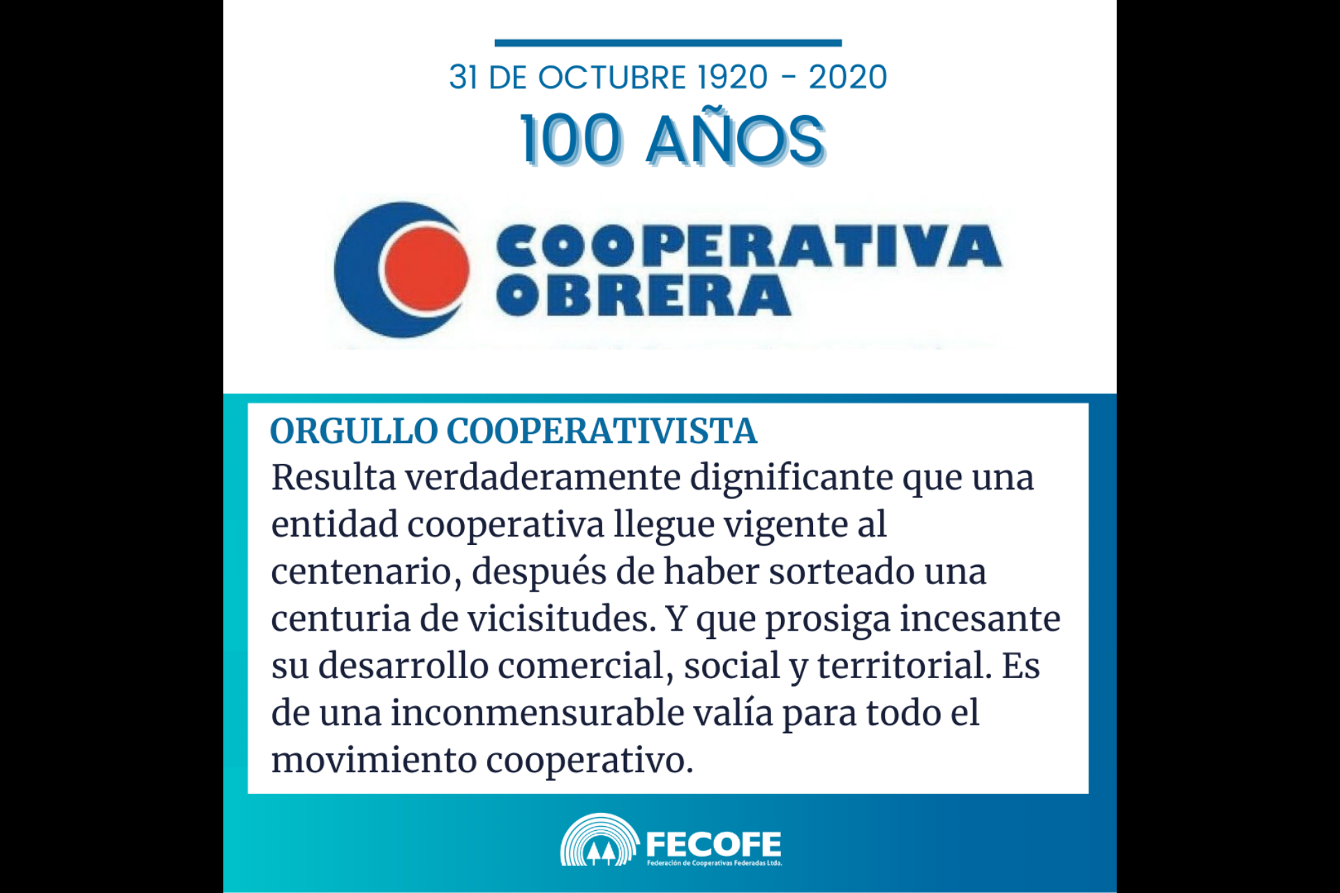 Resulta verdaderamente dignificante que una entidad cooperativa llegue vigente al centenario, después de haber sorteado una centuria de vicisitudes. Y que prosiga incesante su desarrollo comercial, social y territorial. Es de una inconmensurable valía para todo el movimiento cooperativo.