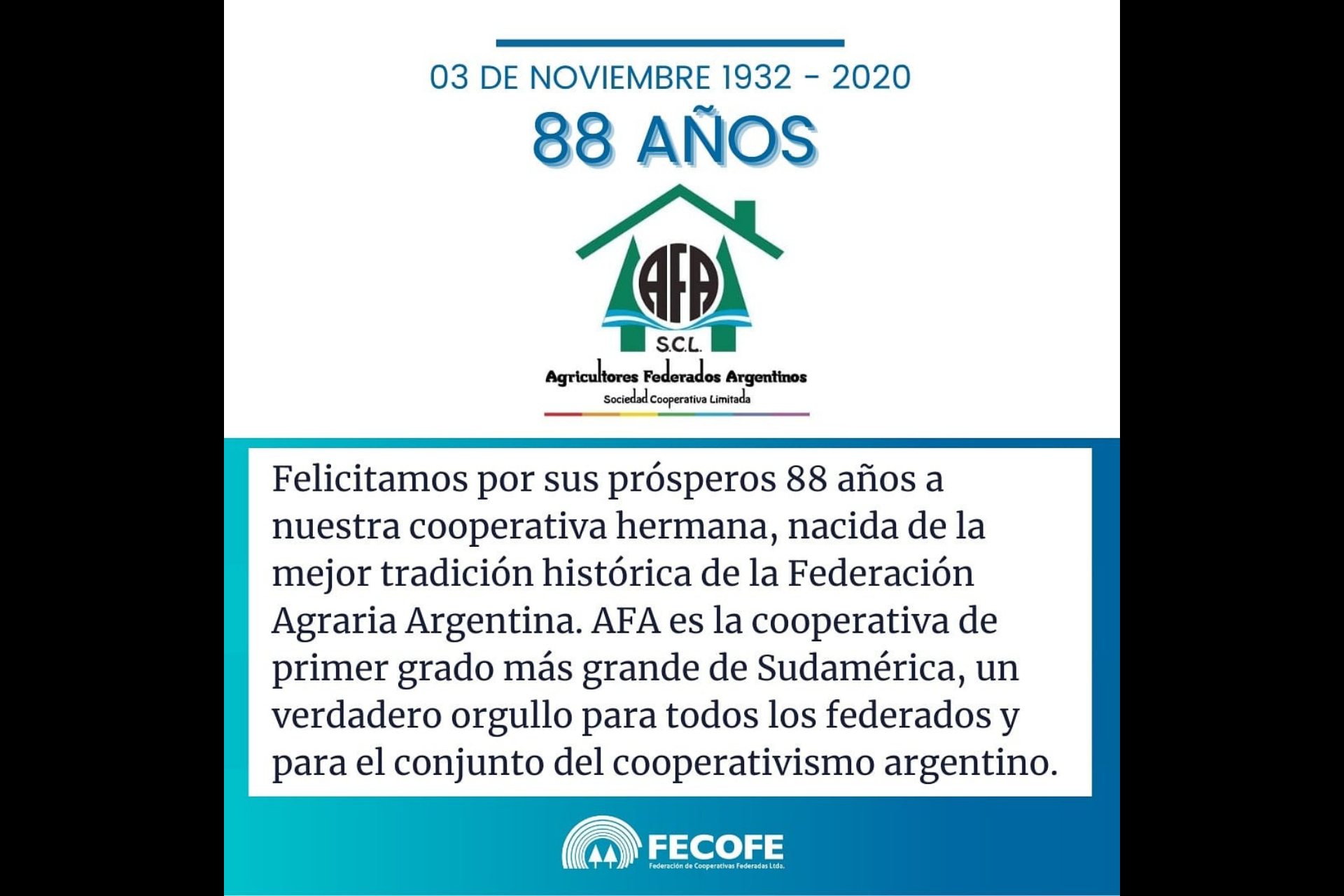 Felicitamos por sus prósperos 88 años a nuestra cooperativa hermana, nacida de la mejor tradición histórica de la Federación Agraria Argentina. AFA es la cooperativa de primer grado más grande de Sudamérica, un verdadero orgullo para todos los federados y para el conjunto del cooperativismo argentino.