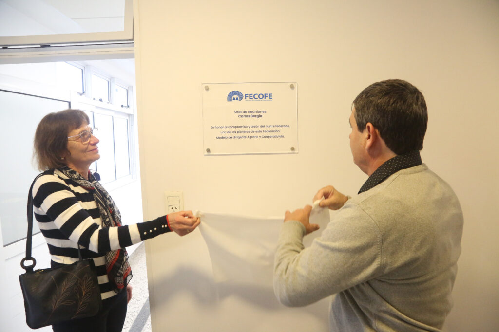 Luego de los actos formales, se procedió al nombramiento de tres salas de la recién adquirida Sede Social, ubicada en calle Mendoza 659. En la planta baja de la institución, la Sala de Reuniones recibió el nombre de “Carlos Bergia”, en honor al respetado dirigente federado y cooperativista miembro de la Cooperativa Agrícola Ganadera de Arroyo Cabral Ltda. y consejero de FECOFE, quien falleció el 21 de octubre de 2021 afectado por el virus Covid-19. En el homenaje, estuvieron presentes su hija, Melisa Bergia, y su esposa, Susana Alesandria.