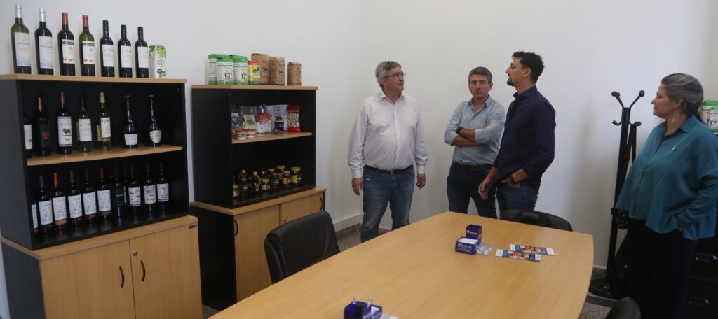 Antes de la reunión, donde se conversó sobre distintos aspectos de coyuntura institucional, política y agropecuaria, el presidente de FECOFE junto al responsable Comercial, Mateo Compagnucci, le mostraron al ministro algunos de los productos elaborados por las cooperativas asociadas a la Federación; vinos, aceite de oliva, miel, maní tostado, yerba mate, entre otros.