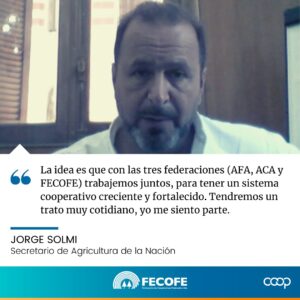 El flamante secretario de Agricultura de la Nación, Jorge Solmi, participó de la última reunión de Consejo de Administración de FECOFE realizada el pasado jueves 25. La sesión fue encabezada por el presidente de nuestra Federación, Juan Manuel Rossi, acompañado por dirigentes de una docena de cooperativas miembro. La sesión, que se desarrolló a través de videoconferencia, comenzó con la presentación del nuevo funcionario.